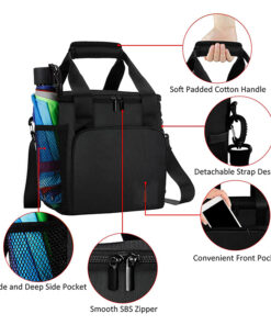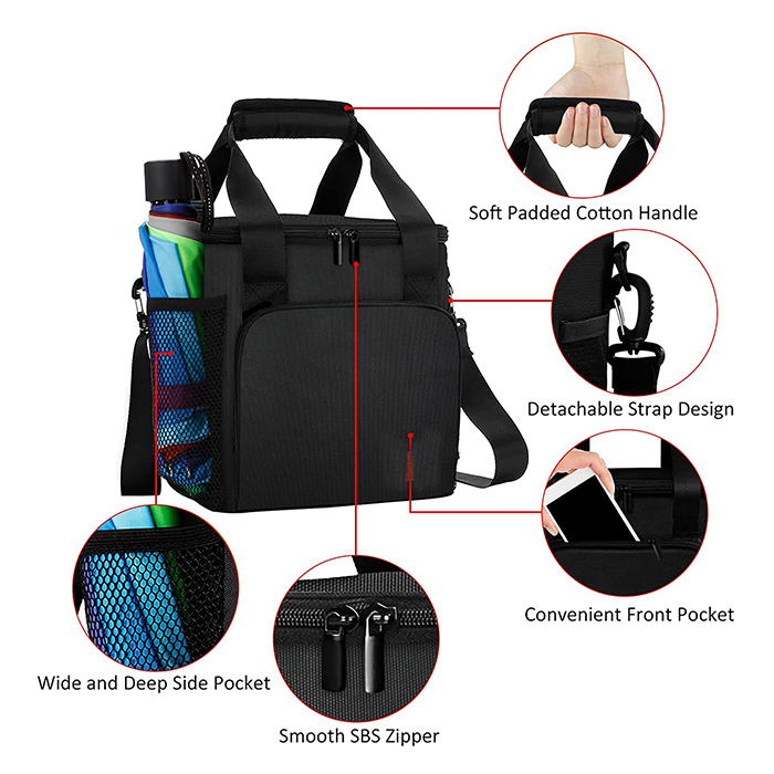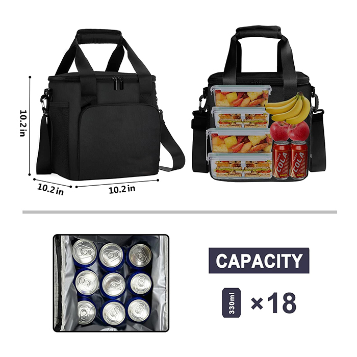 - The thermal lunch box (Size:10.2X10.2X10.2 inch) is designed for maximum storage efficiency, enough for 1-2 person meal. One main compartment fits your bento boxes, drinks, fruits, snacks and other food you want to take, it even roomy enough to hold 18 cans. One front zipper pocket keep your tableware, phone, card, napkin, keys easily accessable and two side mesh pocket for water bottles, umbrella etc.